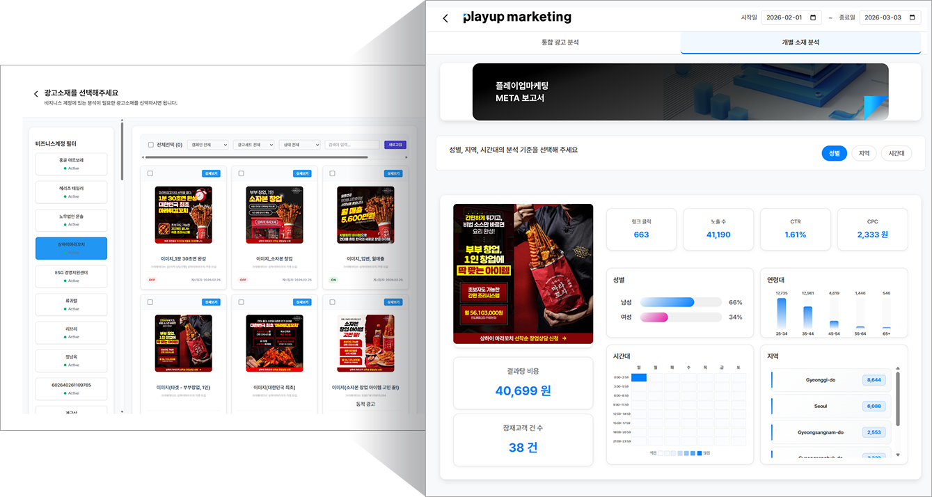 메타 광고 자체 분석 시스템직접 개발한 분석 프로그램을 통한 광고 데이터를 정밀 분석하여 광고 전략 설계 |